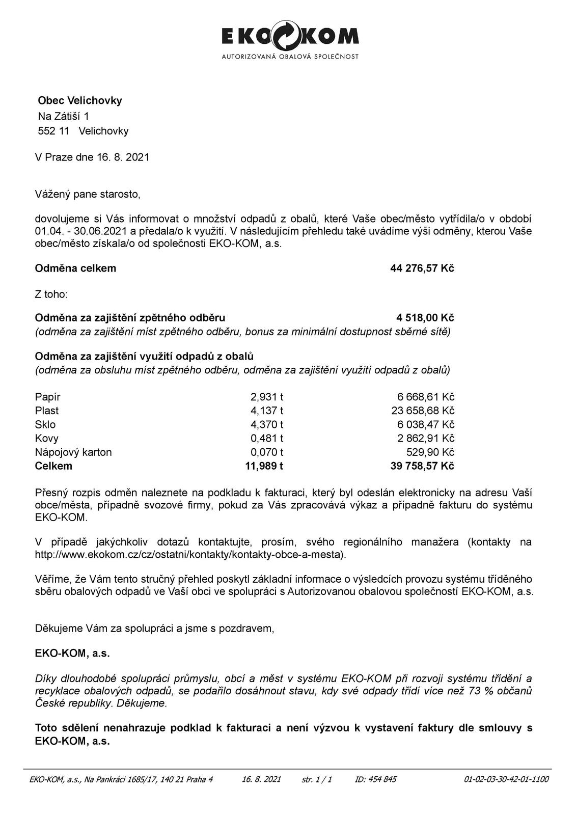 EKO-KOM zpráva o množství vytříděného odpadu za 2 čtvrtletí 2021