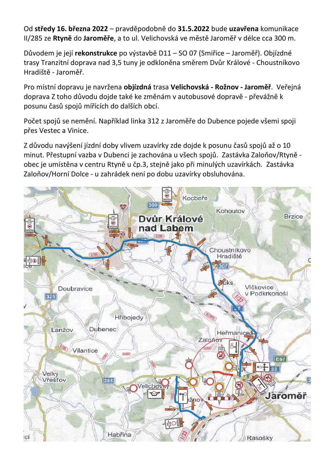 Uzavírka hlavní silnice z Velichovek do Jaroměř (Od Rtyně)
