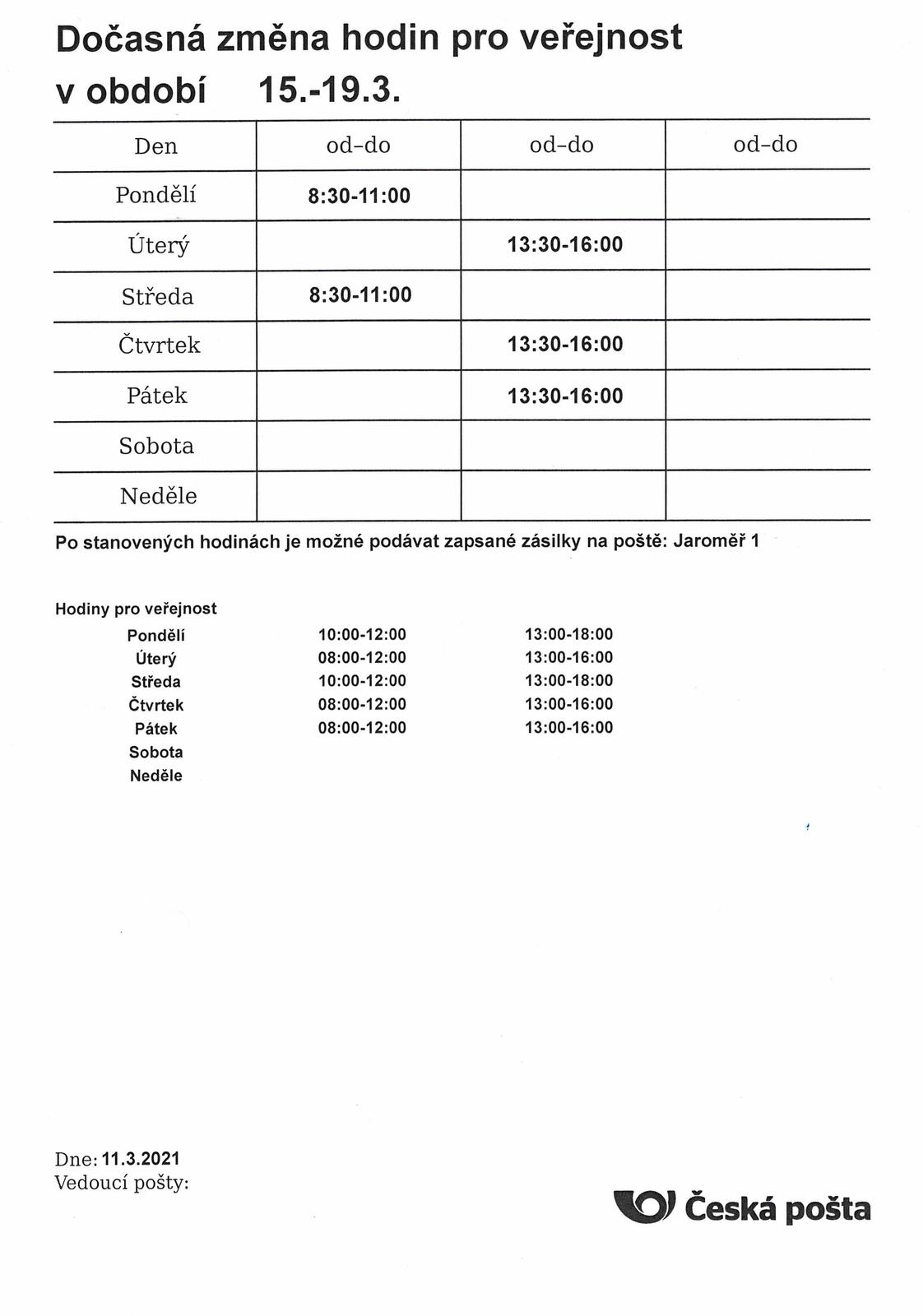 Úvod > Občan > Novinky > Změna otevírací doby pobočky České Pošty
